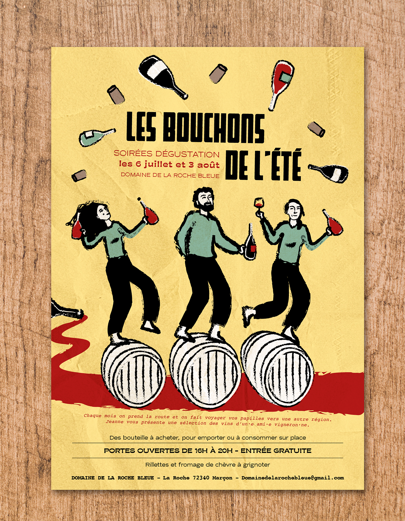 Création de flyers, d'une affiche et d'une animation vidéo pour les soirées dégustations "Les bouchons du jeudi" du Domaine de la Roche Bleue (72340 Marçon).