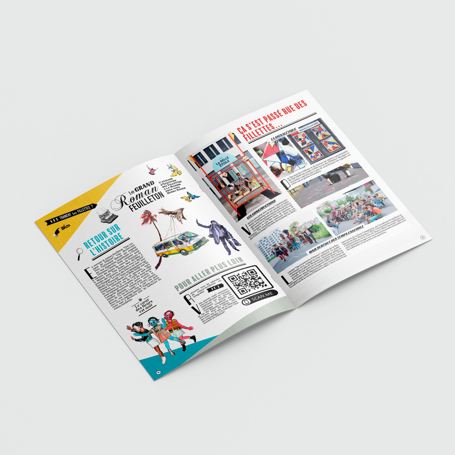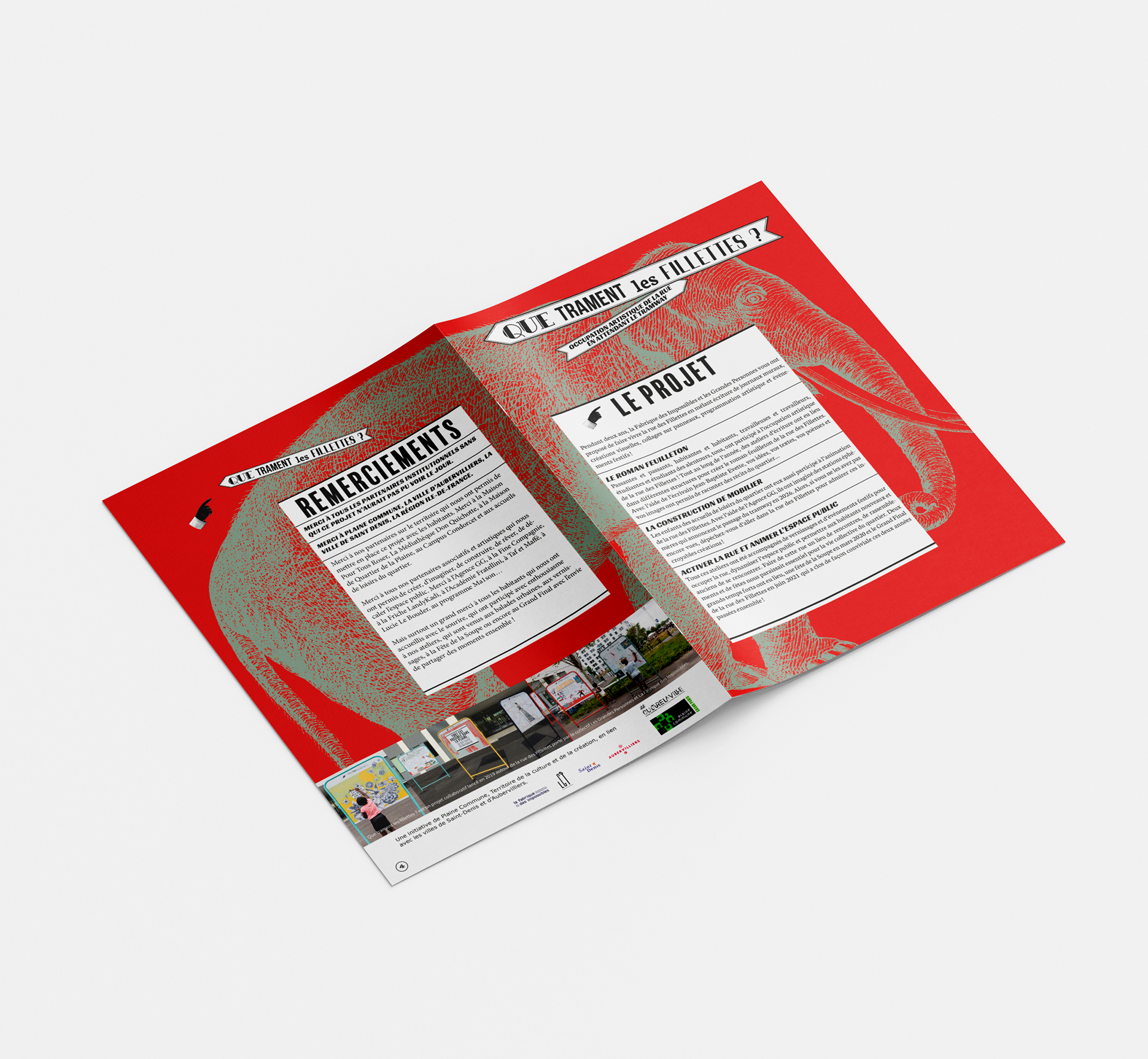 Reprise d’éléments graphiques existants pour la création d’un livret A4 de bilan du projet d’occupation artistique « Que trament les Fillettes ? » par la Fabrique des Impossibles, à Aubervilliers (93300).