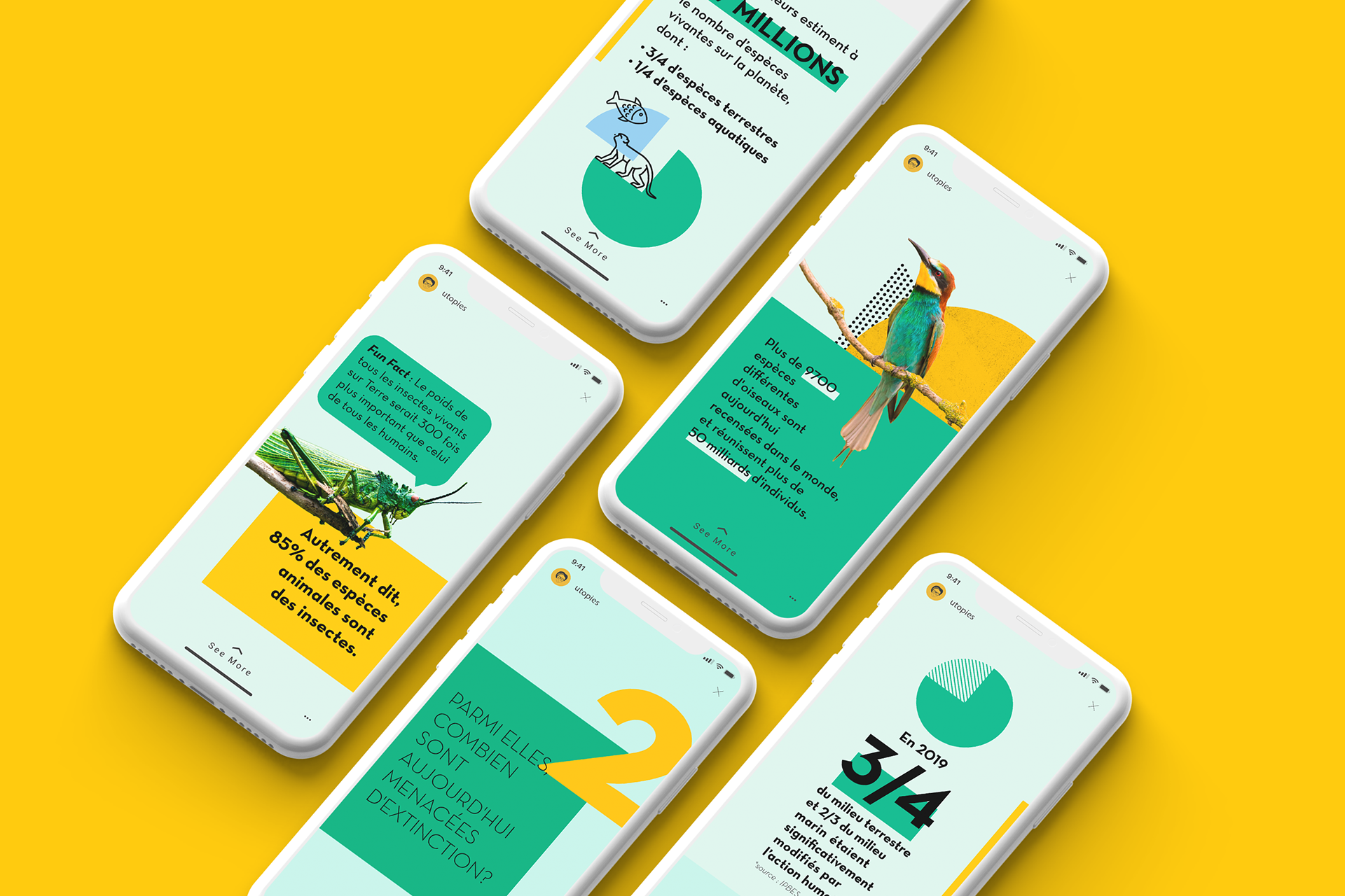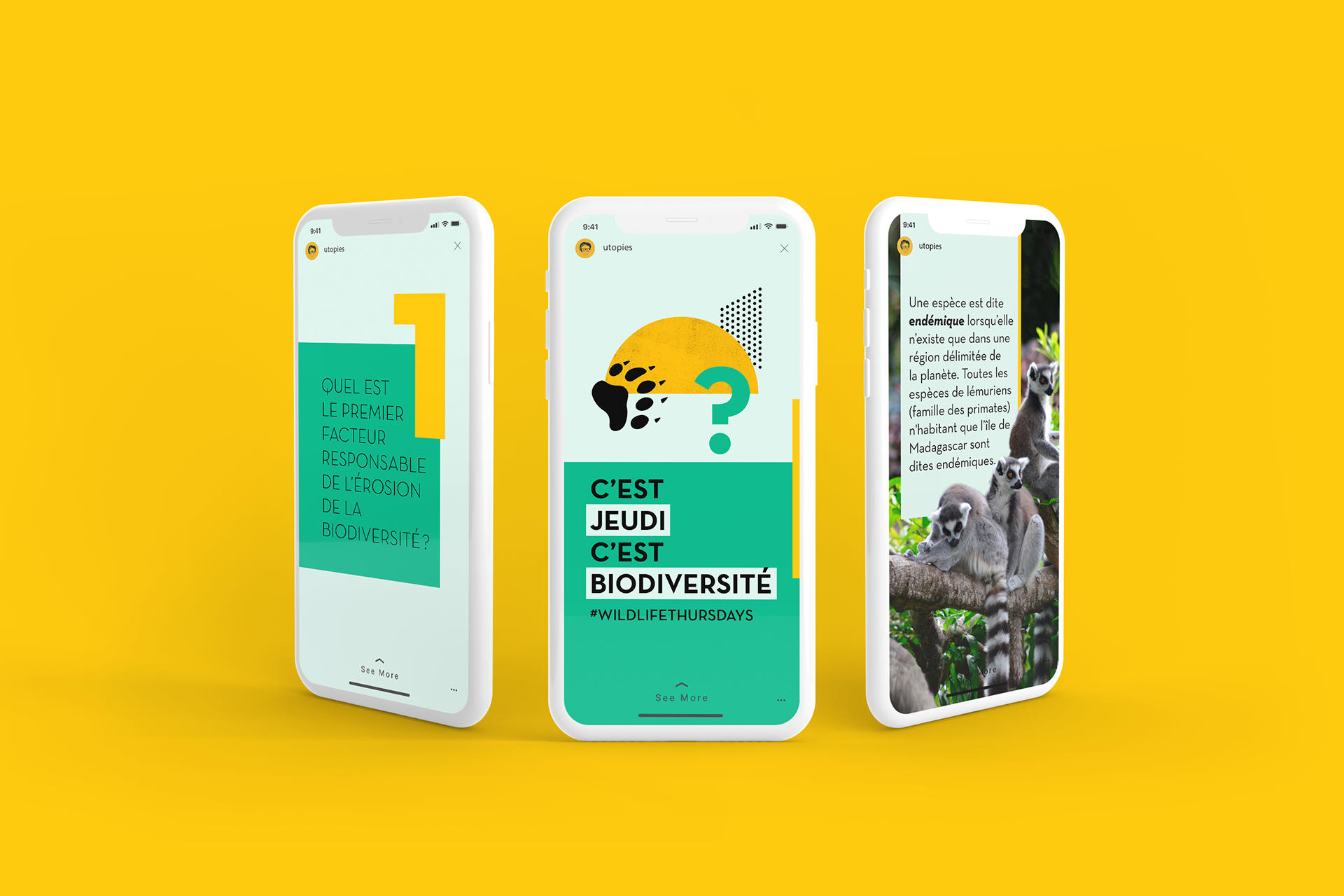 Conception graphique du template et des visuels pour la story Instagram hebdomadaire sur le thème de la biodiversité du cabinet de conseil en développement durable UTOPIES.